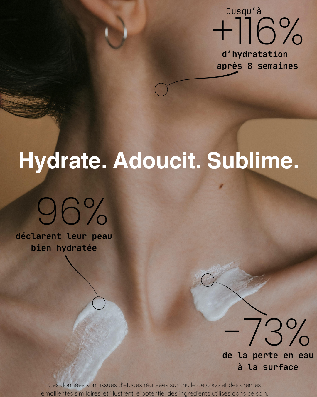 Angereichert mit Kokosöl und pflegenden Wirkstoffen, verhilft diese Behandlung der Haut zu mehr Geschmeidigkeit und Wohlbefinden. Klinische Studien belegen, dass die regelmäßige Anwendung von Kokosöl den transepidermalen Wasserverlust um bis zu 73 % reduzieren kann. Dadurch wird die Hautbarriere gestärkt und Austrocknung vorgebeugt. Auch die Hautfeuchtigkeit verbessert sich: Nach mehrwöchiger Anwendung wurde eine Steigerung von ca. 32 % beobachtet. Untersuchungen an pflegenden Cremes zeigen zudem eine Steigerung des Feuchtigkeitsgehalts um bis zu 116 % bei sehr trockener Haut. 96 % der Anwenderinnen und Anwender berichten von einem angenehmeren Hautgefühl. Diese Pflege bietet eine zarte und wohltuende Textur, die die Haut intensiv nährt, beruhigt und sichtbar geschmeidiger und besser geschützt macht.