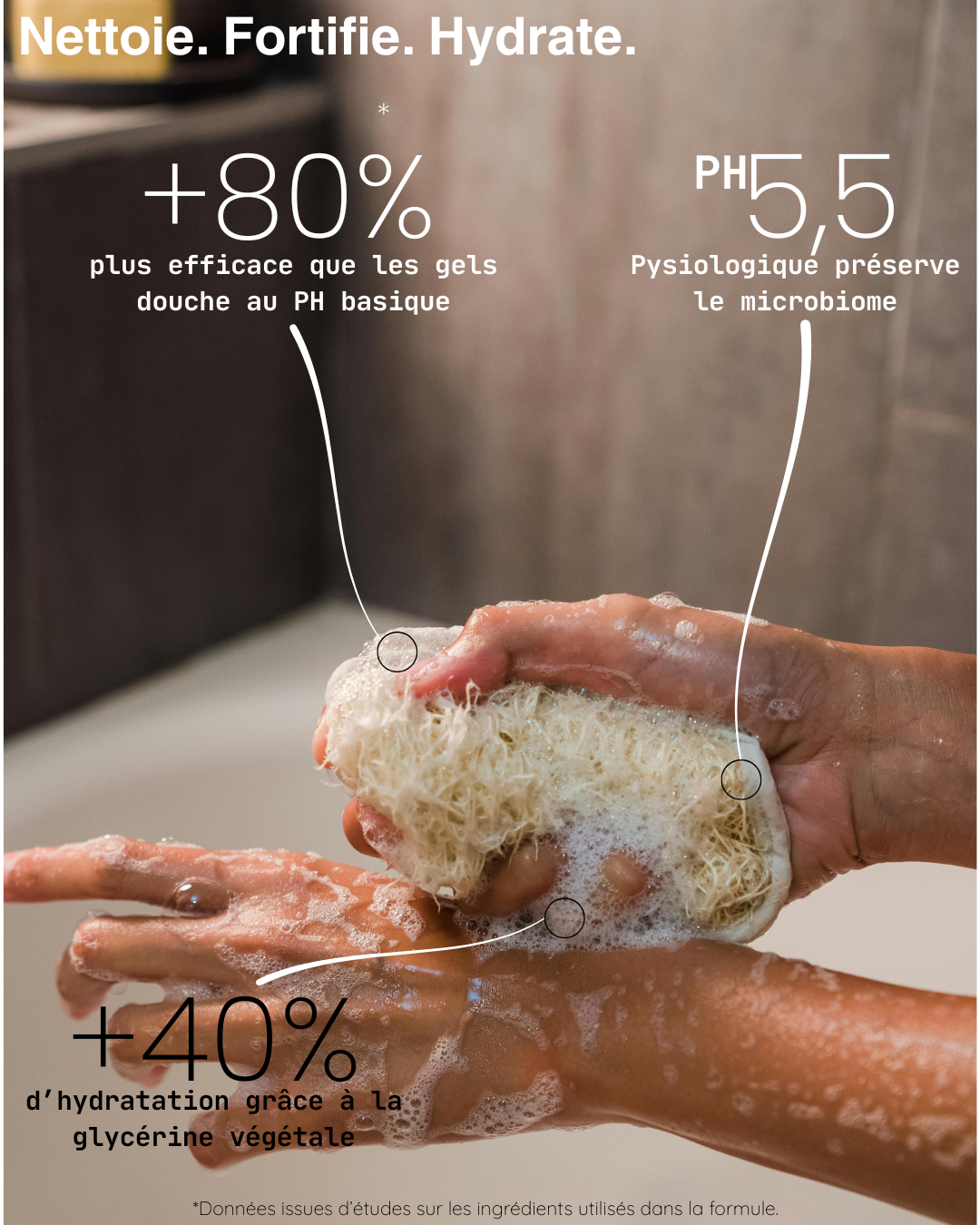 –30 % d’irritation comparé aux gels douche à base de sulfates.